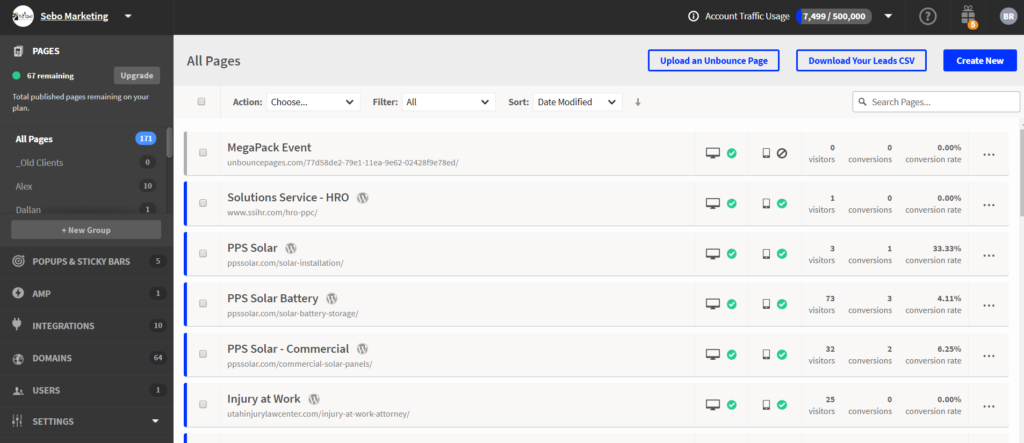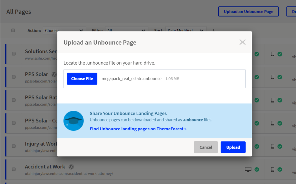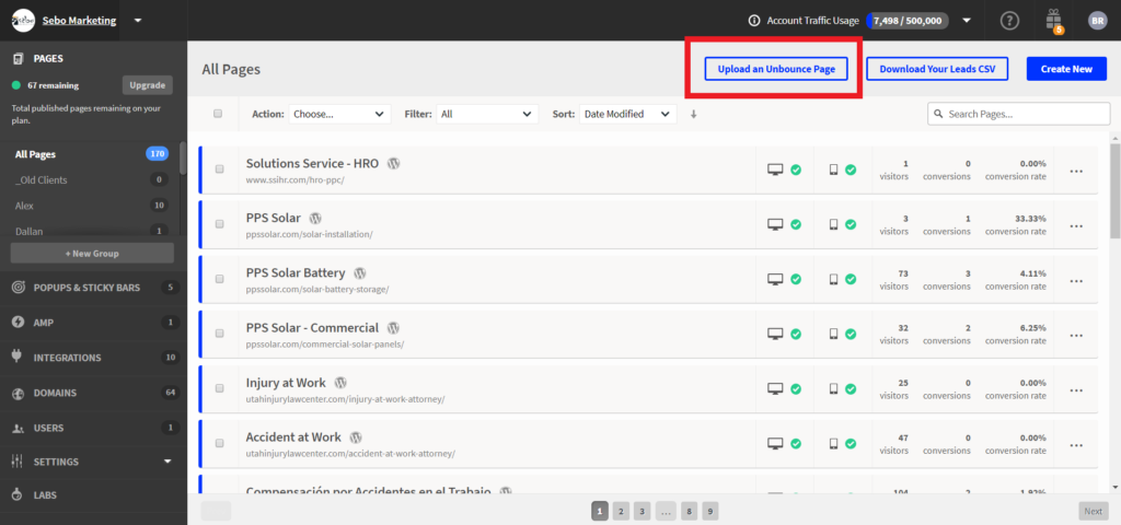 Sign into the unbounce account and at the top right of the browser, select “Upload an Unbounce Page”