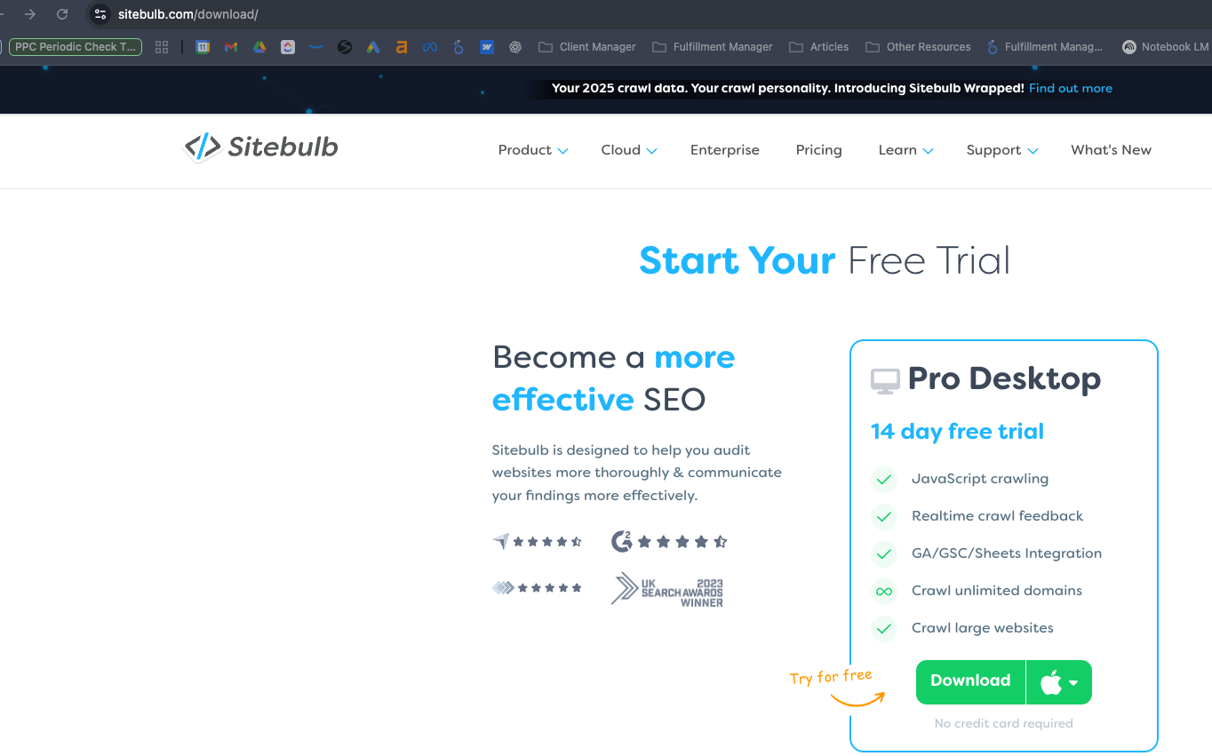 - Click “Try Sitebulb for Free” > Download